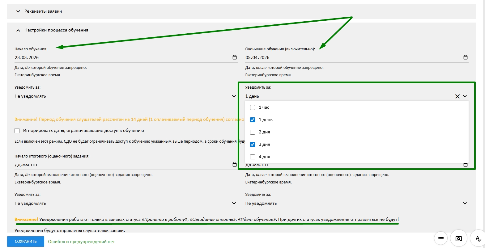 Отправка уведомлений менеджеру заявки о начале и окончании обучения